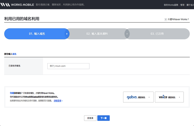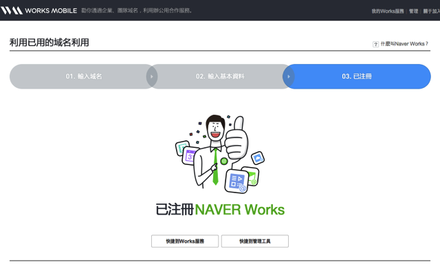 Email 信箱是屬於較私人、需要更高隱私的功能,一般來說,我們不會隨意選擇一個無法信賴的公司,即便像是中國大陸的「阿里雲」也推出可自訂網址的企業信箱,或者之前我專文介紹的國外免費服務 Pawnmail,在使用上仍有些疑慮,甚至擔心我們的郵件內容是否被第三方取得,或者免費服務就突然關閉、停止。 直到最近香腸炒魷魚介紹一款全新的「Works Mobile」服務後,似乎在 Google Apps 之外又有了一個免費、可信賴的選擇。 首先,Works Mobile 來自於 Naver ,也就是 LINE 背後的韓國母公司,讓你透過企業、團隊網域名稱,整合旗下的相關服務,包括電子郵件、日曆、通訊錄、Drive(雲端硬碟)和 Office 等工具。 不僅如此,Works Mobile 也很有誠意地推出了中文版介面,我們可以很輕鬆地操作、進行相關設定,它就好像一個簡化版的 Google Apps,其實該有的功能都有,而且速度、穩定性方面都無須擔心。預設信箱容量為 10 GB,再搭配上雲端硬碟空間 10 GB ,等於每個帳號總共有 20 GB 的可用空間,對大多數人來說已經相當充裕。 Works Mobile 自訂網址信箱提供 300 個使用者配額,也就是說如果你的團隊、公司小於這個人數,只要把網址設定好,大家都能開啟自己的 Email 信箱,透過提供的雲端硬碟、日曆、通訊錄和 Office 來實現團隊協作功能。 網站名稱:Works Mobile 使用教學STEP 1 開啟 Works Mobile 網站後,點選首頁的「免費利用」按鈕,如果你沒有網域名稱的話,可以直接在網站上註冊一個(延伸閱讀:推薦的四個網域名稱註冊商),若你已經有自己的網址,想要把它對應到這項服務,請選擇左邊「已有域名的用戶」按鈕。