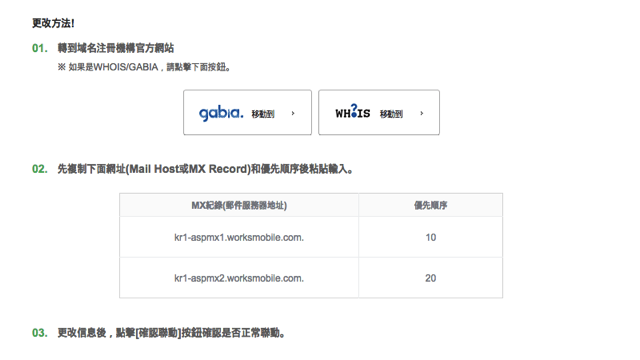 把頁面往下拖曳,會有設定的三個步驟,點選「更改 MX 紀錄」下方的鏈結,也就是查看更改方法,Works Mobile 會顯示你必須設定的 MX 紀錄。無論你使用的 DNS 是由註冊商提供,或者指向你的虛擬主機公司,你都要找到設定 DNS 紀錄的頁面,把 Works Mobile 頁面顯示的兩個紀錄設定到你的網域名稱。