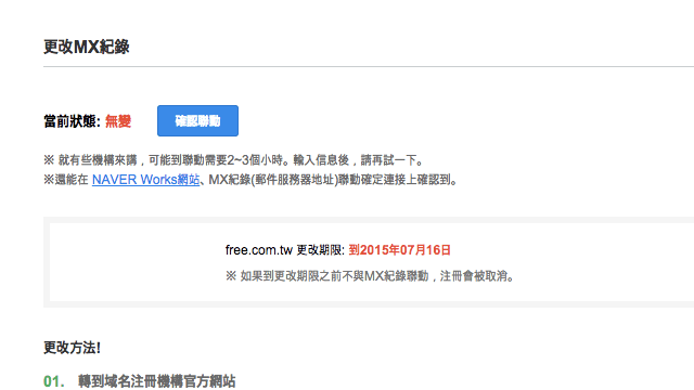 Works Mobile 會給你大約 14 天,也就是兩週左右的設定時間,若兩週內沒有完成,你的註冊就會被取消,也無法使用 Works Mobile 的相關工具。 當你完成 MX 紀錄設定後,別忘記回到註冊頁面,點選「確認聯動」按鈕,當檢測到你的 MX 紀錄已經設定、指向 Works Mobile 後,就能開始使用這項服務囉!