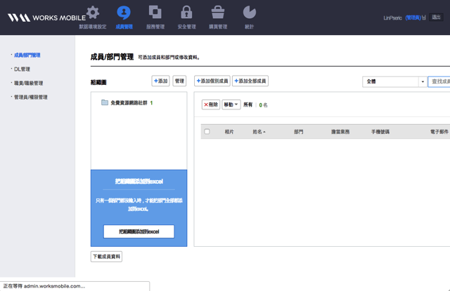 STEP 7 此外,Works Mobile 跟 Google Apps 一樣都有管理員主控台,只要點選右上角的「Works 管理」,或者存取 https://admin.worksmobile.com/ 網址,以管理員的帳號、密碼登入就能進行網域內的相關設定,包括加入成員、部門管理、郵件群組、發送限制,也能設定預設環境、服務管理、安全管理、統計等等。