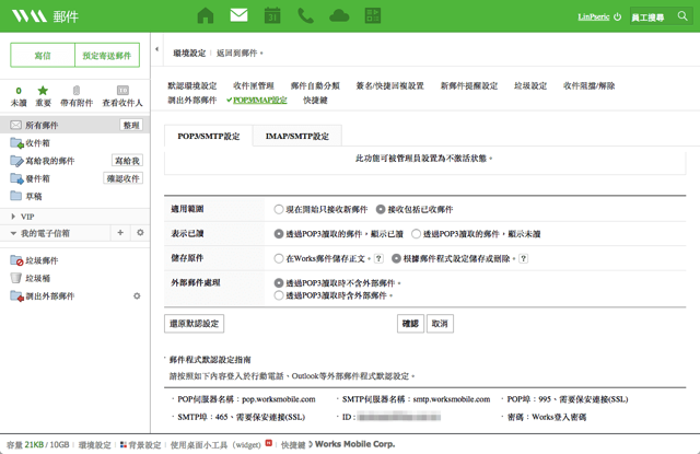 STEP 6 如果你習慣使用郵件軟體,或者透過 Gmail 來收發外部信箱,Works Mobile 也支援 POP3 和 IMAP、SMTP,可以點選信箱下方「環境設定」鏈結,從「POP3/SMTP」設定來找到相關設定方法,在預設情況下,這個功能是被啟用的,你可以在頁面最下方找到相關設定值,例如 POP、SMTP 伺服器名稱、Port、帳號和密碼等資訊。