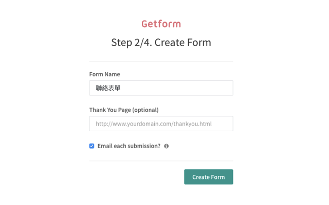 STEP 2 建立表單前,設定一下表單名稱及感謝頁面網址,感謝頁面就是當使用者提交表單後會被重新導向的目標頁面(可不設定),預設情況下會回到的 Getform 歡迎畫面。