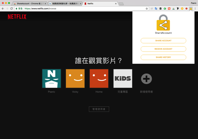 根據 ShareAccount 官方網站說明,分享及接收者雙方都必須安裝此外掛,透過輸入「接收代碼」方式來產生特定的程式碼,複製並貼給接收者,將這段代碼使用於自己的 ShareAccount 外掛即可取得加密後的工作階段(Session)。分享者可以設定對方可使用帳戶的時間限制。 例如 Netflix 目前並沒開放家庭共享方案,但又希望讓帳號可以被其他家人使用(Netflix 雖沒有明確限制規定,但 CEO 表示是可以的),透過 ShareAccount 就能做到,以下我會簡單示範使用方式,不限於 Netflix,任何可以在 Google Chrome 瀏覽器登入的網路服務都能利用此功能共享。 擴充功能資訊元件名稱:ShareAccount 使用教學STEP 1 開啟 ShareAccount 官方網站可以找到 Chrome 應用程式頁面及下載鏈結,如果要共用帳戶,分享者及接收者雙方都必須安裝 ShareAccount 外掛才行,不過不限於 Windows 或 Mac,可以跨作業系統共用。