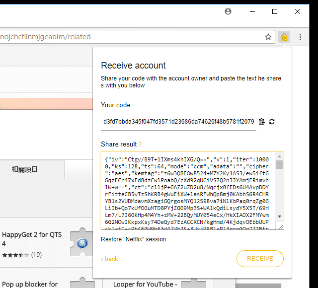 STEP 6 最後,被分享者(接收者)將收到的程式碼貼到「Share Result」後,點擊「Receive」就會發現已經可以存取登入的帳戶囉!是不是非常簡單呢?在貼上時 ShareAccount 會提示要還原的工作階段,例如你分享的是 Netflix,下方就會顯示 Restore “Netflix” session 提示訊息。